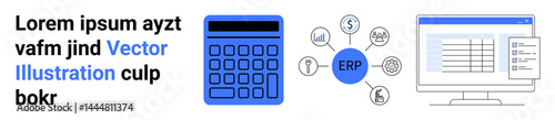 Calculator with financial charts, ERP hub surrounded by business icons, computer screen showing a table. Ideal for business management, planning, finance, accounting, data analytics, tech simple