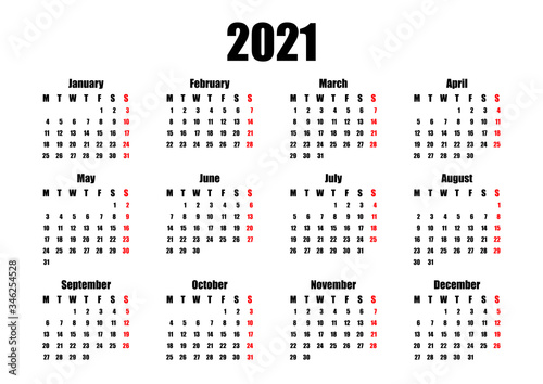 calendar 2021, week starts on Monday, basic business template. vector illustration