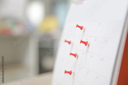 Calendar, Close-up red pin on blank desk calendar with paper stack and office equipment concept of event planner or personal organization for business and appointment reminder and schedule planning.