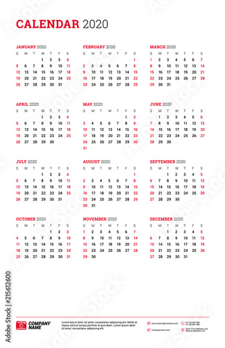 Calendar for 2020 year. Week starts on Sunday. Printable vector stationery design template