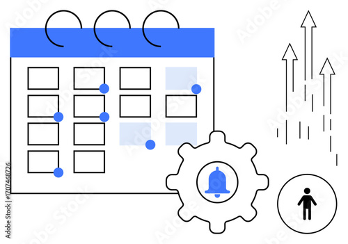 Calendar grid with blue highlights, reminder gear, person icon, arrows pointing upwards. Ideal for planning, productivity, organization, time management goal tracking strategy improvement. Simple
