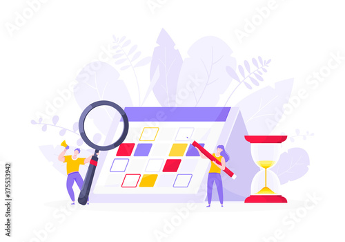 Calendar planning schedule business concept vector illustration. Tiny people with magnifier glass, big hourglass do working plan on day calendar and checks dates. Time management or deadline metaphor.