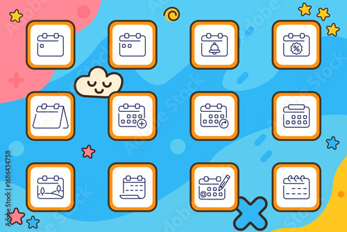 Calendar set icon. Icons of planner sheets, reminders, date additions, deadlines, and scheduling tools outlined on a soft blue abstract background