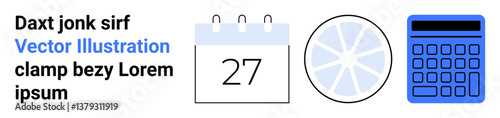 Calendar with date, blue calculator, abstract circle design, bold black and blue text. Ideal for planning, calculation, scheduling, management, meetings productivity themes simple landing page