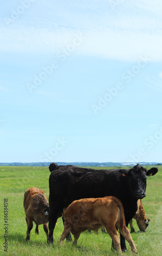 Calf drinking milk from mother cow in lush green field. Lots of room to the top for text