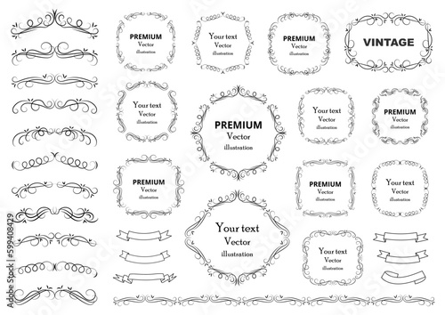 Calligraphic design elements . Decorative swirls or scrolls, vintage frames , flourishes, labels and dividers. Retro vector illustration
