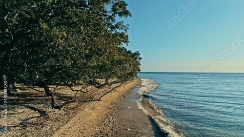 calm and relaxing aerial drone image of a stunning beautiful hidden remote ocean sea shore at sunset with an endless sandy beach and lush tropical rainforest jungle closeup waves crashing
