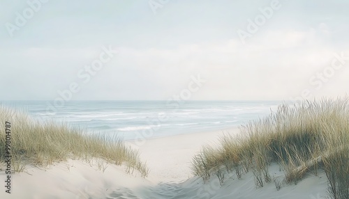 Calm Beach with Rolling Dunes and Ocean Meeting the Horizon under Summer Sky