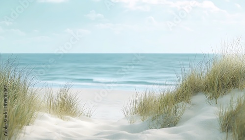 Calm Beach with Rolling Dunes and Ocean Meeting the Horizon under Summer Sky