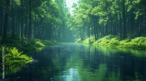 Calm river winding through a dense forest: A tranquil river flows slowly through a thick forest of tall trees. The water reflects the green canopy above, and the scene feels serene