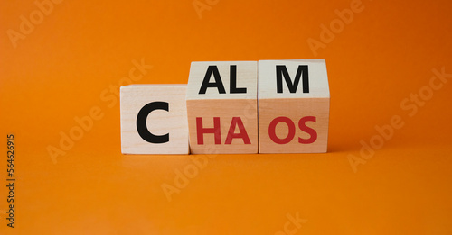 Calm vs chaos symbol. Turned wooden cubes with words Chaos and Calm. Beautiful orange background. Business and Calm vs chaos concept. Copy space.
