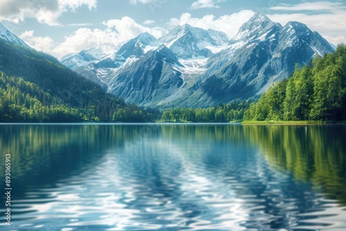 Calm water and reflecting peaks at a serene mountain lake, surrounding forest, tilt-shift blur effect, focus on peaks, vibrant, overlay, picturesque nature backdrop