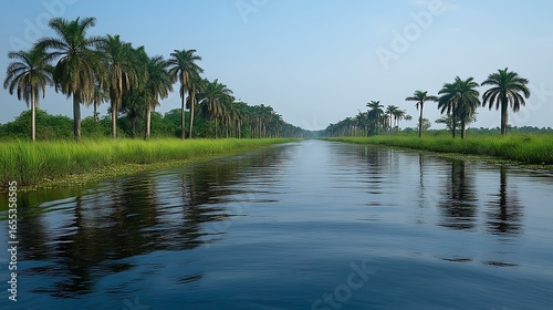 Calm waterway lined with palm trees.