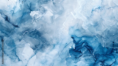Calming marble ink abstract art in soft blue and white, smooth transitions, simple and colorful on fine paper texture