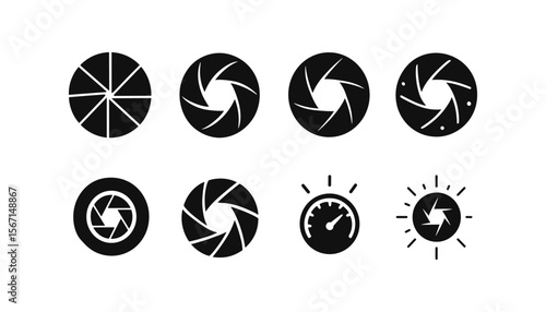 Camera aperture silhouette icon set. photography, shutter speed flat collection