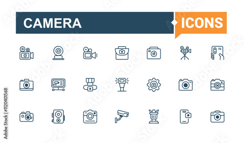 Camera linear icon collection. Contains related to digital, hand, projector, image, app, shoot, lens and more. Outline symbol collection.