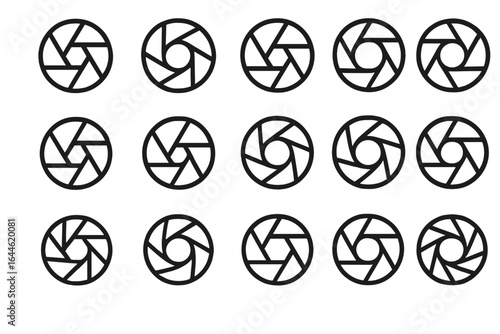 Camera shutter icon set. Vector aperture symbols collection. Black and white diaphragm illustration for photography logo. Minimalist lens graphic for web design element.