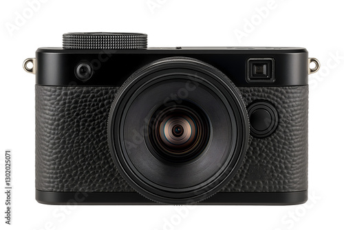 Camera with Leather Texture and Lens against Black Background Studio Shot