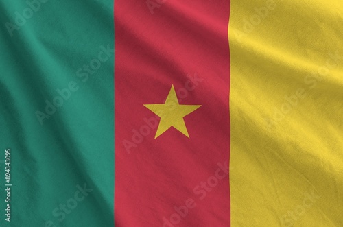 Cameroon flag depicted on folded wavy fabric of old cloth close up