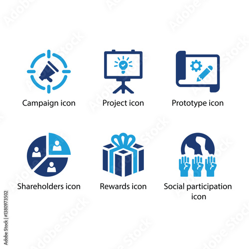 Campaign, Project, Prototype, Shareholders, Rewards, Social participation, Blue Icon Set