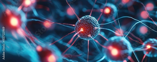 Cancer cells concept. Close-up view of glowing cells showing interconnected structures and vibrant colors.