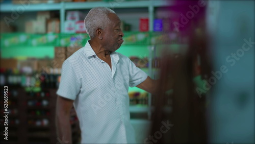 Candid elderly African American man selecting beverage from shelf at grocery store. One senior black male shopping for alcoholic drink at supermarket