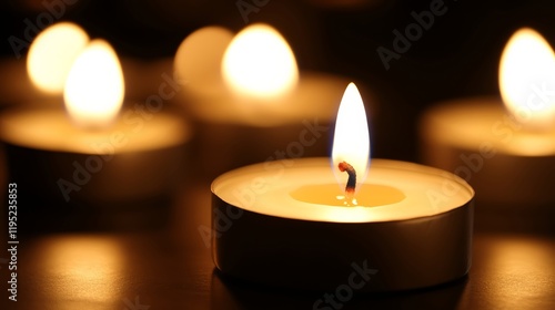 Candle flame flickering gently in a dark room, casting soft, hopeful shadows
