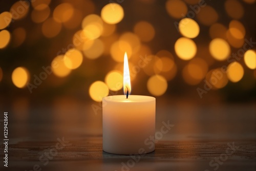 Candle with warm flame atop a wooden surface, surrounded by golden bokeh lights in the background. Concept of light, peace, and tranquility. Ai generative