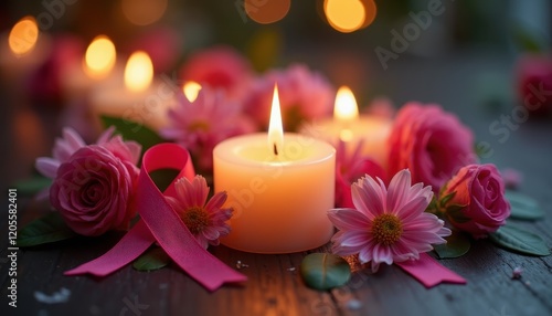 Candlelight surrounded by flowers and ribbons symbolizing hope for cancer.