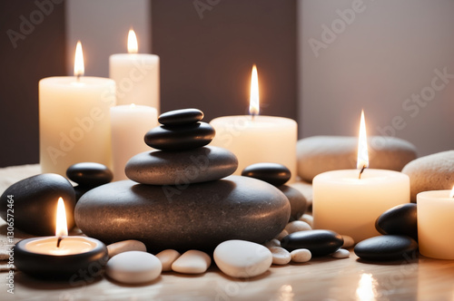 Candles and smooth stones provide an ambience of relaxation and tranquility, ideal for a spa.