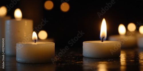 Candles Burning at Night. White Candles Burning in the Dark with focus on single candle in foreground