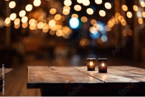 Candles on a wooden table in a restaurant with bokeh background. For product display, Generative Ai