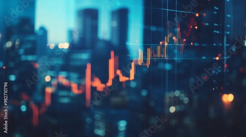 candlestick chart on blurry city backdrop. Trade, technology, investment and analysis concept. Double exposure