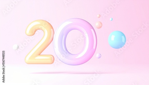 Candy-Coated '20' Celebration, A Pastel Dreamscape of Shiny Numbers and Floating Spheres