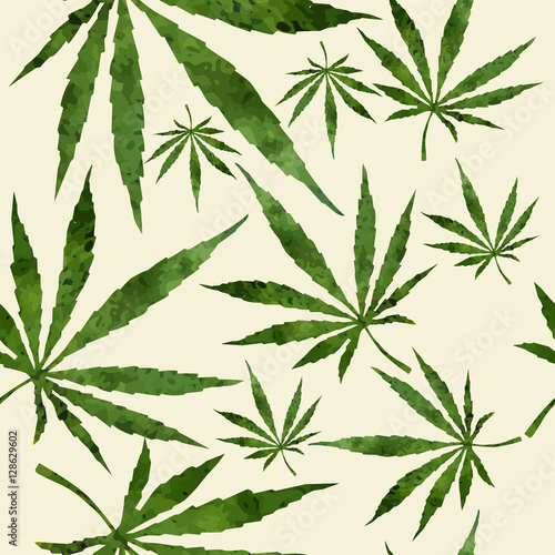 Cannabis leafs seamless pattern. Vector image. Watercolor paper backdrop.