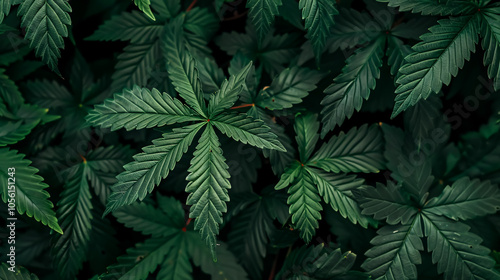 Cannabis leaves background. Hemp plant green leaf close-up. Growing organic cannabis herb plantation on the farm. Marijuana cultivation, alternative medicine concept.