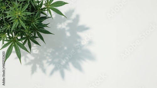 Cannabis plant positioned at the edge with scissors shadow on a soft white backdrop, representing leaf harvesting for cloning and personal cultivation
