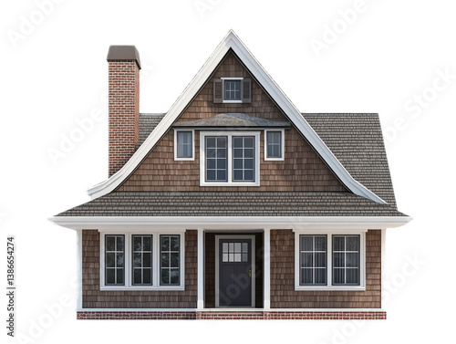 Cape Cod cottage with cedar shingles, central chimney, and symmetrical facade, isolated on white background