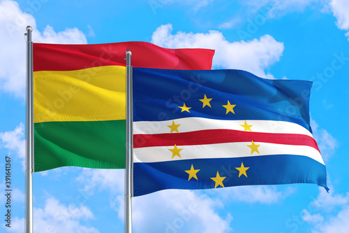 Cape Verde and Bolivia national flag waving in the windy deep blue sky. Diplomacy and international relations concept.