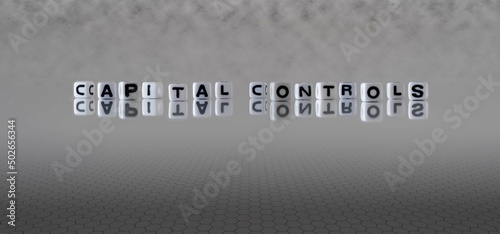 capital controls word or concept represented by black and white letter cubes on a grey horizon background stretching to infinity