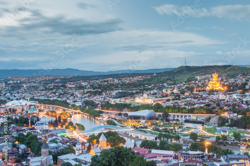 Capital of Georgia - Tbilisi at night against the dark blue sky.
