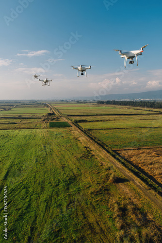 captivating aerial image showcasing drones operating in vast agricultural landscape emphasizing their role in