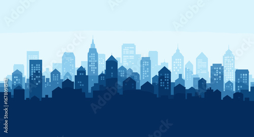 Captivating cityscape silhouette showcasing modern urban architecture in varying shades of blue, perfect for business and city-themed projects.