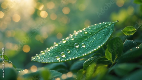 Captivating close-up of a leaf adorned with raindrops in a vibrant, surreal garden setting during early morning light