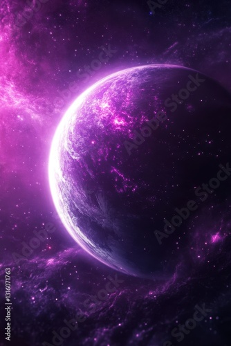 Captivating cosmic vista of a vibrant purple planet amidst a star studded nebula background space exploration celestial