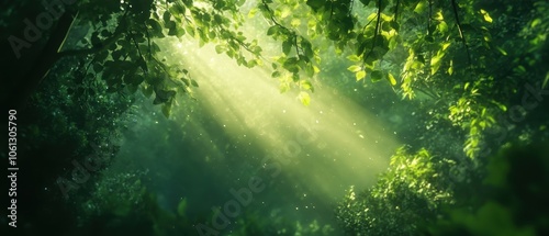Captivating dappled sunlight filtering through lush green tree leaves in a serene forest setting