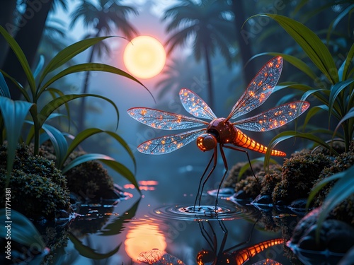 Captivating dragonfly glowing above a serene waterway at dusk with lush greenery and a dazzling sunset, digital art of fantasy concept.