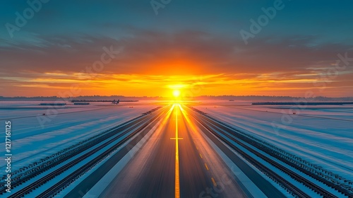 Captivating high angle aerial view of an airport runway at golden sunrise with the smooth tarmac and clear skies creating a serene and peaceful setting