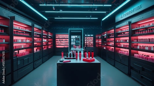 Captivating holographic beauty influencer setup with floating neon cosmetics lights and digital displays in a futuristic high tech beauty studio