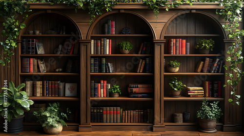 Captivating Illustration of Three Unique Bookshelves Loaded with an Assortment of Books and Flourishing Plants in a Cozy Setting